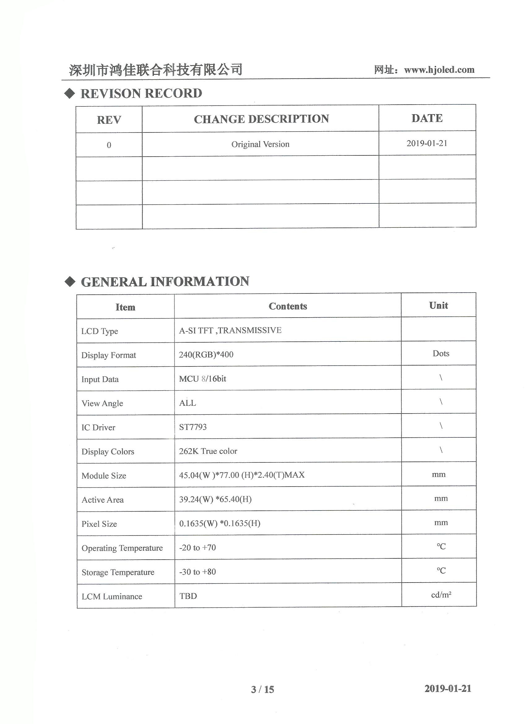 Display area AA size: 65.4 (W) * 39.24 (H) mm
