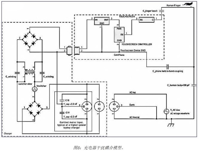 觸摸屏干擾的另一個潛在來源是電源供電手機充電器的開關電源。干擾通過手指耦合到觸摸屏上,如圖5所示。小型手機充電器通常有交流電源火線和零線輸入,但沒有地線連接。充電器是安全隔離的,所以在電源輸入和充電器次級線圈之間沒有直流連接。然而,這仍然會通過開關電源隔離變壓器產生電容耦合。充電器干擾通過手指觸摸屏幕而形成返回路徑。