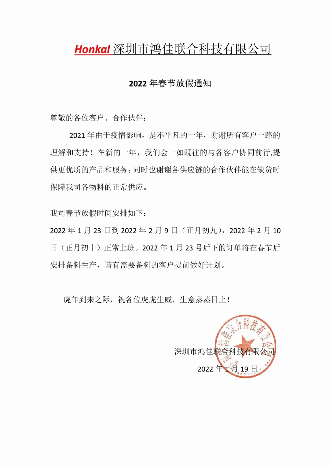 深圳市鴻佳聯合科技有限公司2022年春節放假通知