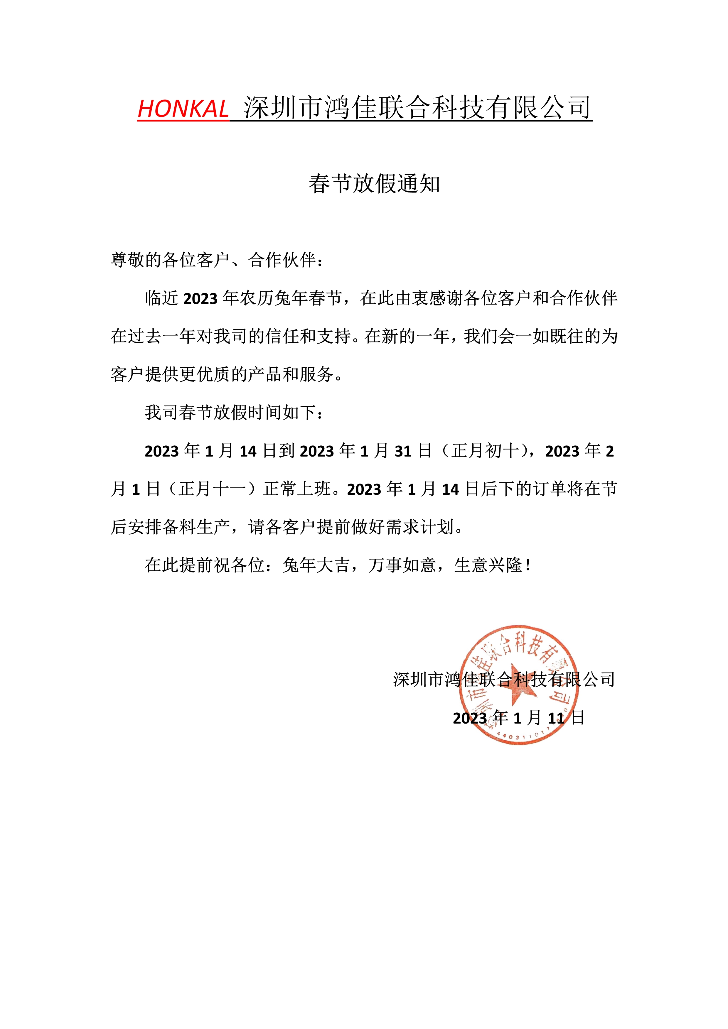 深圳市鴻佳聯合科技有限公司2023年放假通知