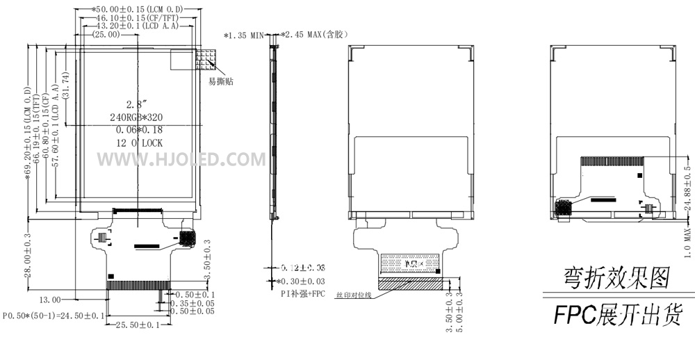 2.8寸TFT LCD模組寬視角 240*320接口SPI/MCU/RGB,標準50PIN