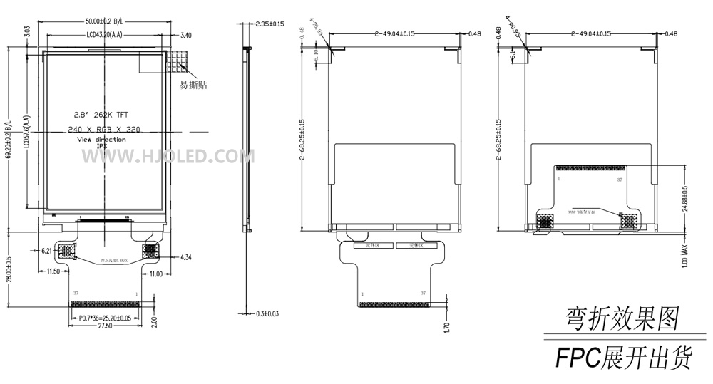 2.8寸TFT LCD模組IPS ,2.8寸IPS、2.8寸LCD,240*320,37PIN FPC焊接 ILI9341V