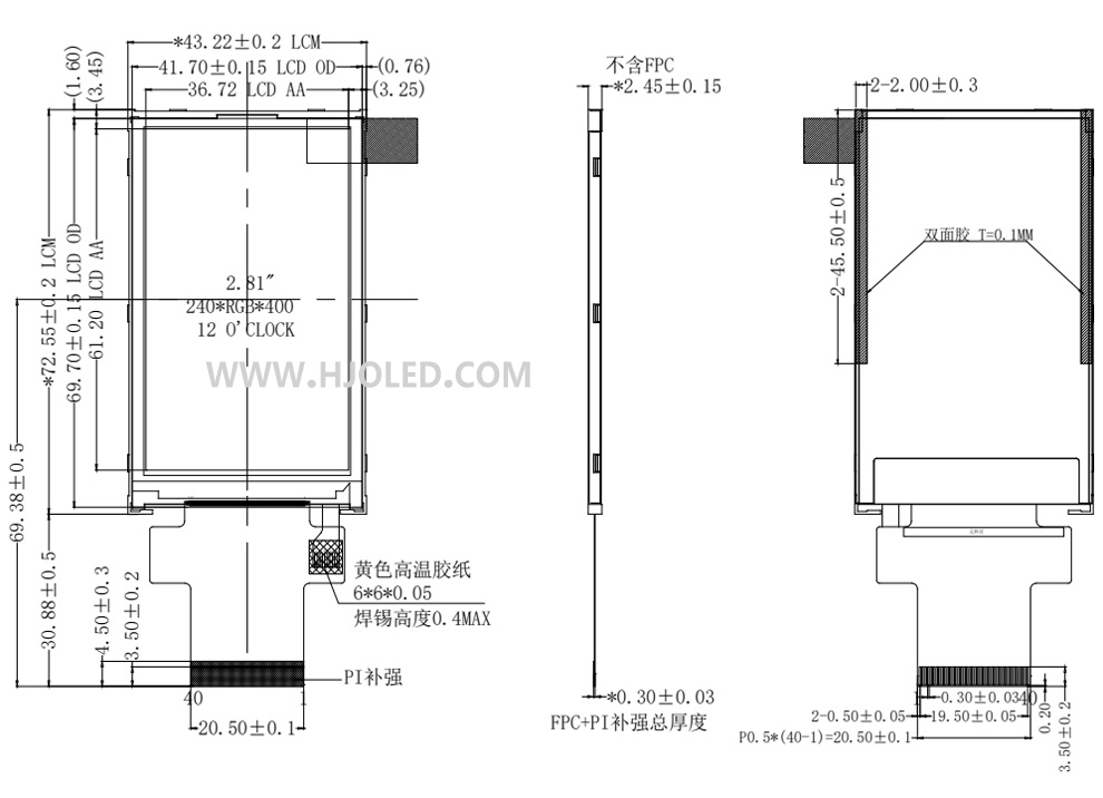 產品簡介:HJ2802-01,2.8寸TFT屏,16:9豎屏240*400分辨率,ILI9327接口MCU,可應用于工業設備、血氧儀、手持檢測儀器、美容設備、智能家居、消費電子等產品上,我們公司可以按客戶的要求提供定制。