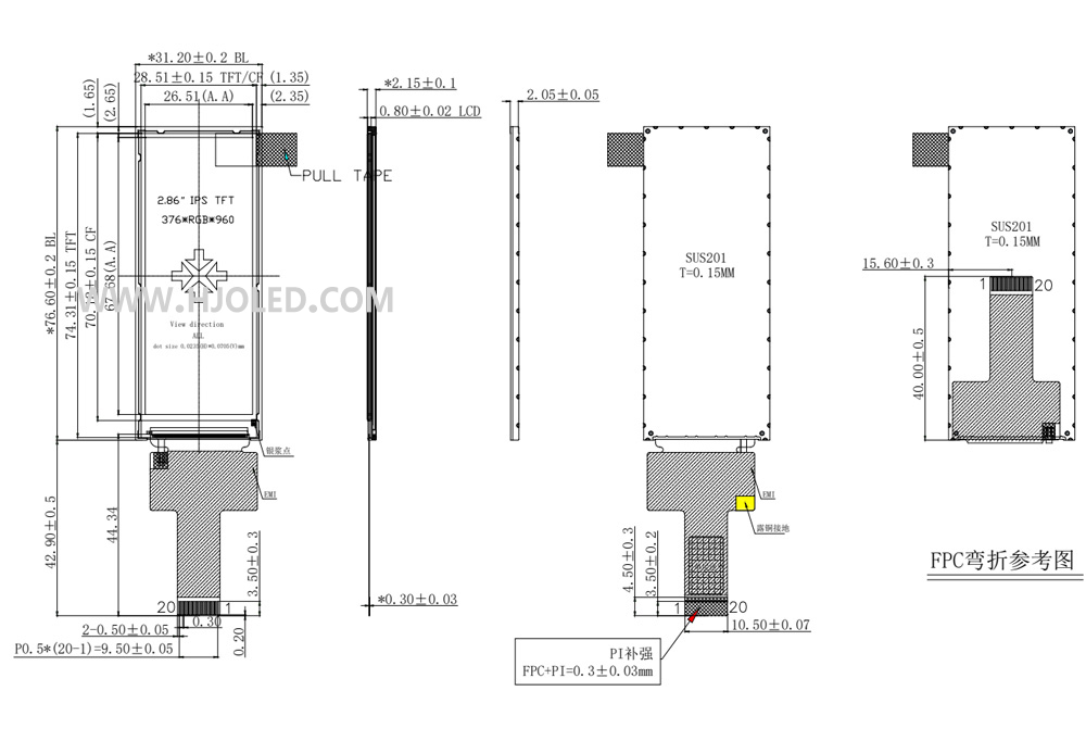 2.9寸TFT LCD長條屏,2.9寸長條屏MIPI 1/2 Lane接口、ST7701S 20PIN