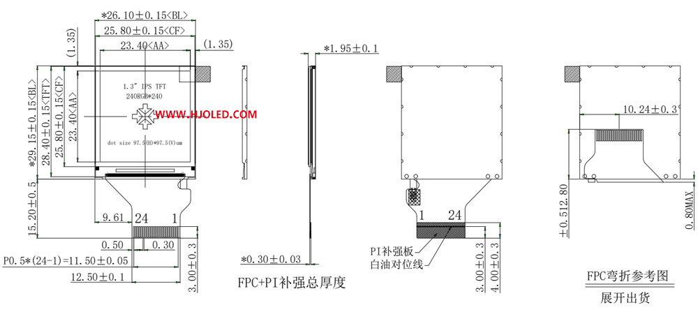 1.3寸 TFT LCD模組支持MCU/SPI接口、IPS全視角24PIN插接