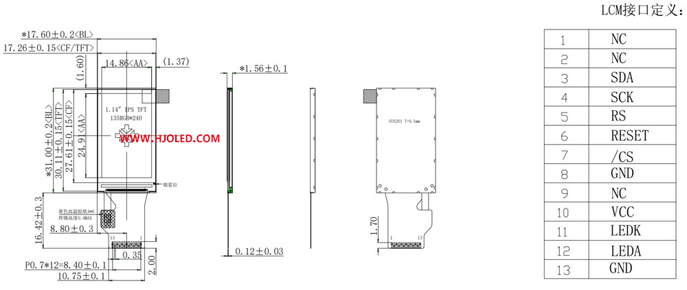 產品簡介:HJ1140-01是一款1.14寸TFT LCD模組支持SPI接口,采用常規ST7789驅動IC,13PIN,高亮陽光下可讀,1.14寸LCD 長條屏可應用于血氧儀、手持儀器設備、數碼產品、穿戴產品,電子煙等產品上,1.14寸IPS屏幕我們公司可以按客戶要求接受定制。