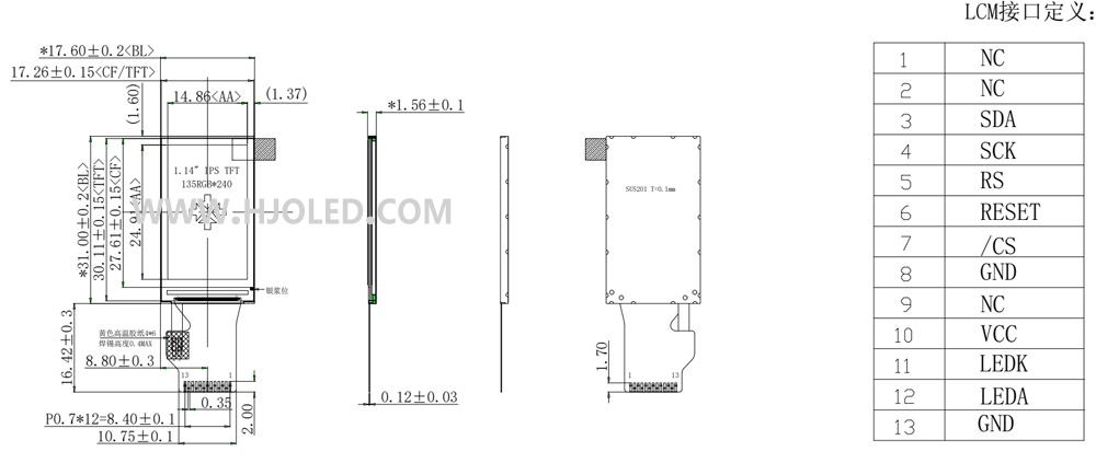 1.14寸長(zhǎng)條TFT LCD模組,1.14寸長(zhǎng)條屏4-wire SPI、IPS陽(yáng)光下可讀13PIN