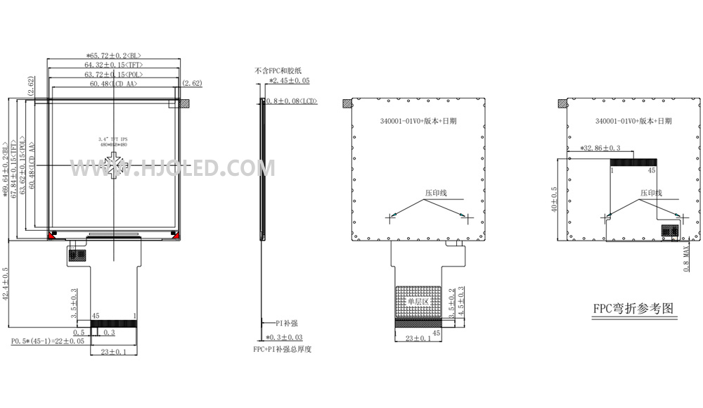 3.4寸方形LCD,3.4寸TFT方形液晶屏,支持RGB接口IPS,480*480,45PIN插接