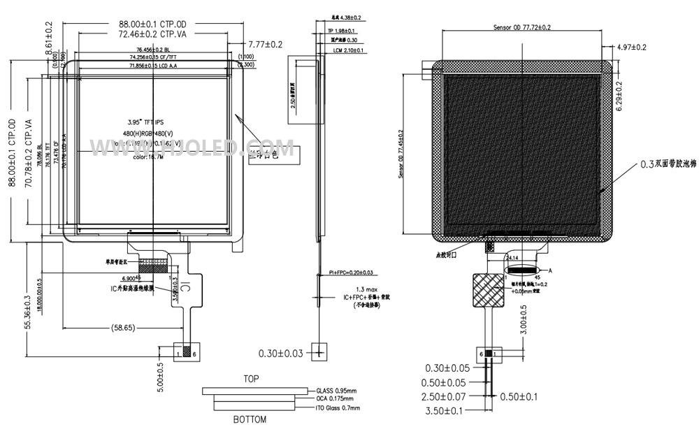 3.95寸方形觸摸屏,3.95寸觸摸屏總成IPS, 480*480分辨率,多點觸摸GT1151Q