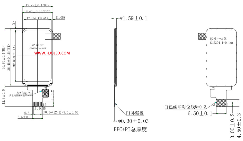 1.47寸TFT LCD模組長(zhǎng)條屏4-wire SPI接口、IPS陽(yáng)光下可讀12PIN