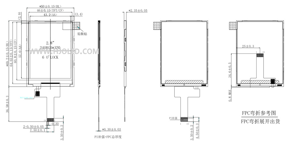 2.8寸TFT LCD模組 SPI接口高亮800cd/㎡,14PIN簡單好設計