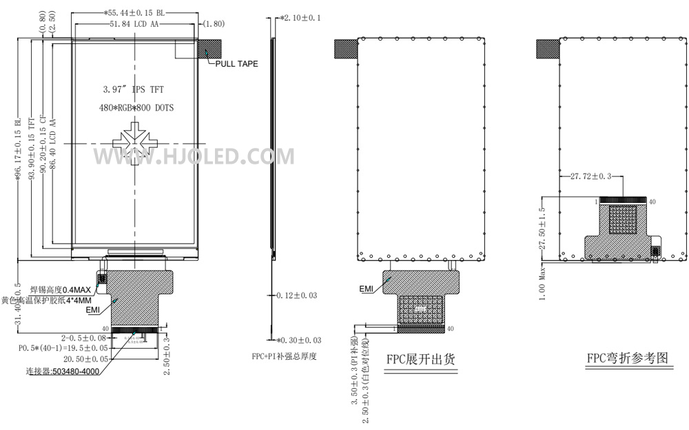 3.97寸TFT LCD模組3.97寸IPS 480*800分辨率ST7701S接口RGB 40PIN高亮900流明