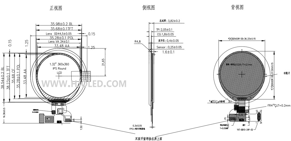 1.32寸圓形LCD屏帶觸摸屏,1.32寸圓屏觸摸屏總成GG結構,高分辨率360*360,GC9C01接口QSPI