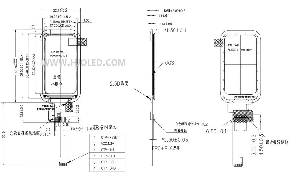 1.47寸長條形液晶觸摸屏總成,G+G結(jié)構(gòu),4-wire SPI接口、IPS陽光下可讀12PIN