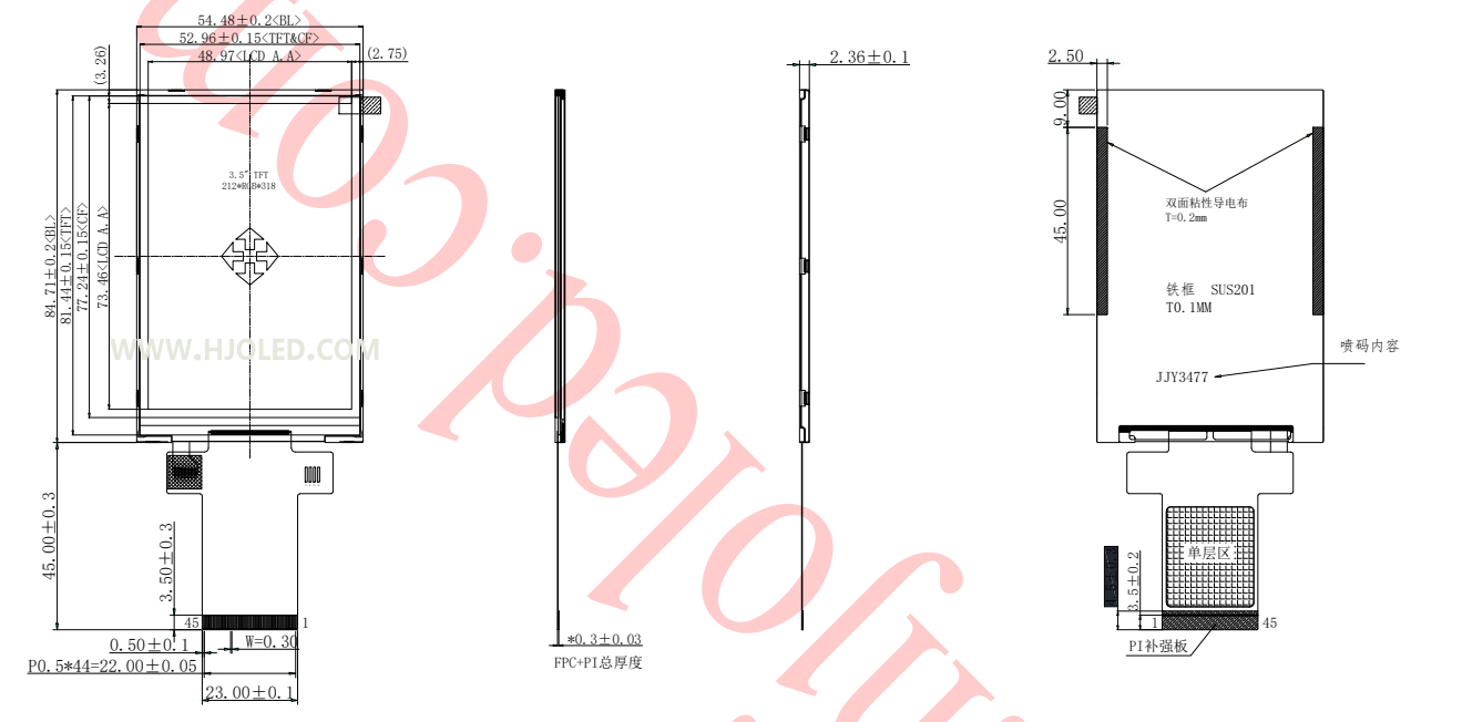 產品簡介:HJ3505-01是一款低成本方案的顯示屏,212*318的分辨率,支持SPI/MCU/RGB接口,豎屏高亮,適合對價格比較敏感的客戶使用。