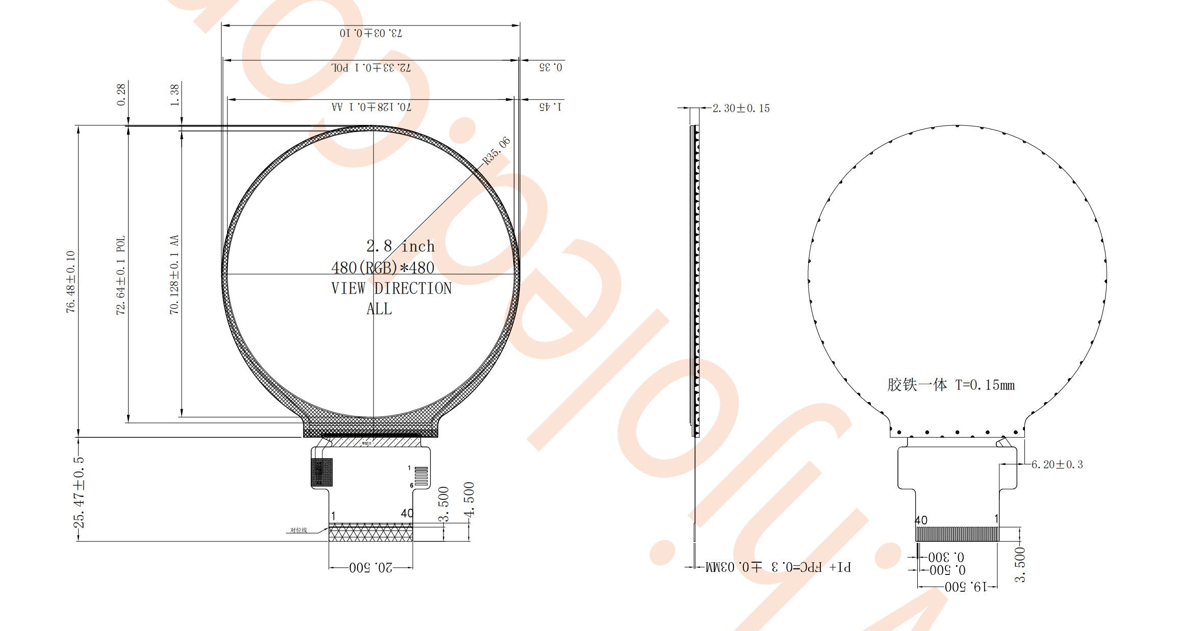 2.8寸圓形液晶屏 480*480,標準40PIN插接RGB接口帶觸摸屏