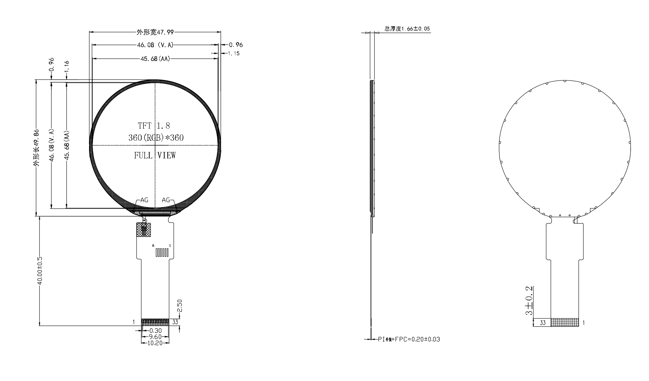 產(chǎn)品簡介:HJ1800-01是一款1.8寸圓形液晶屏,兼容SPI/MCU/QSPI/MIPI接口,通過IM口可以選擇接口,33PIN標(biāo)準(zhǔn)插接,分辨率360*360,超寬工作溫度-30到85度。