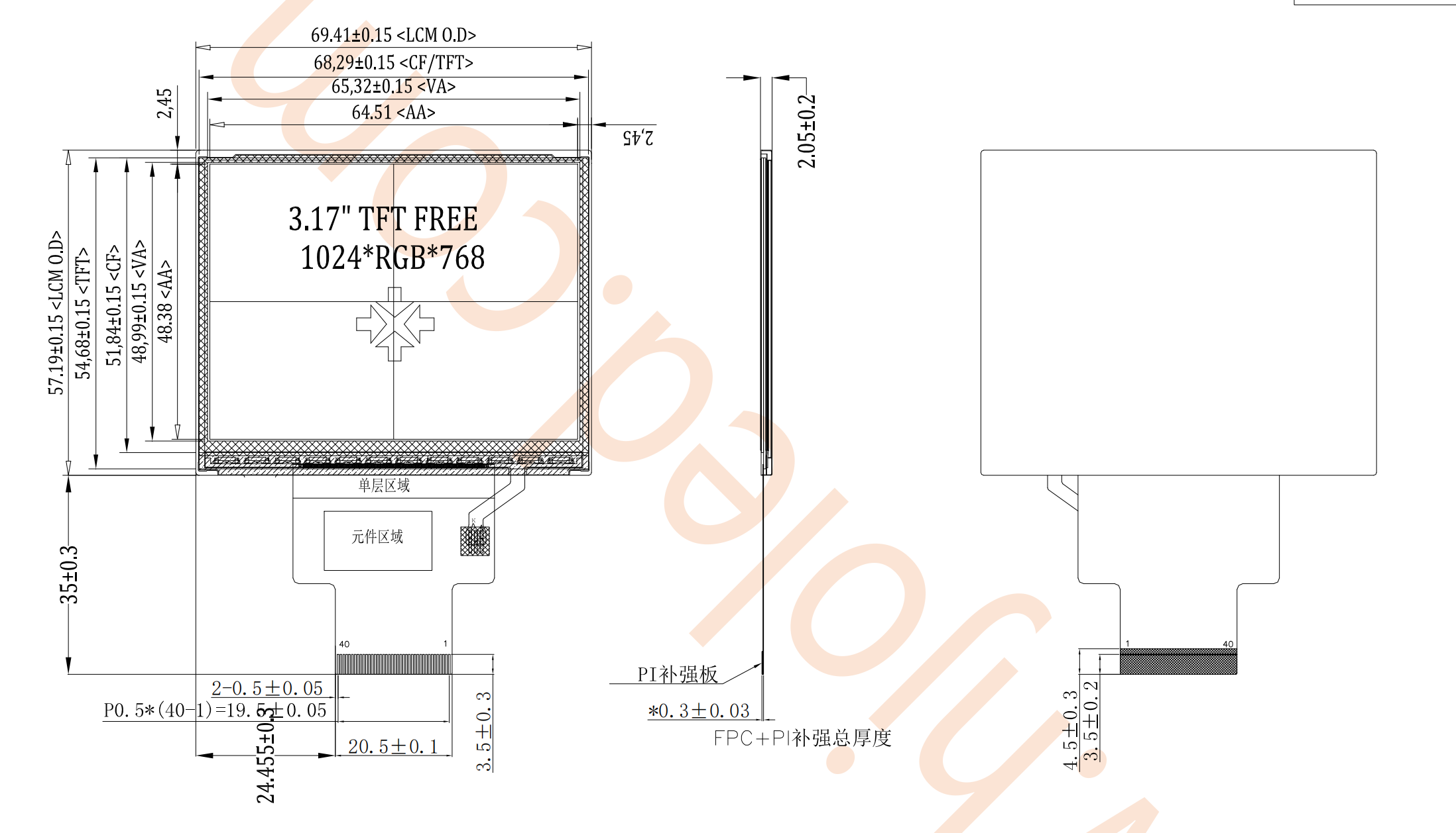 產品簡介:3.17寸TFT橫屏支持16/18/24BIT RGB接口,40PIN標準插接,分辨率1024*768,高清分辨率,橫屏顯示,左右邊框均等黃金比例,亮度支持500-1000流明,戶外陽光直射清晰可讀。